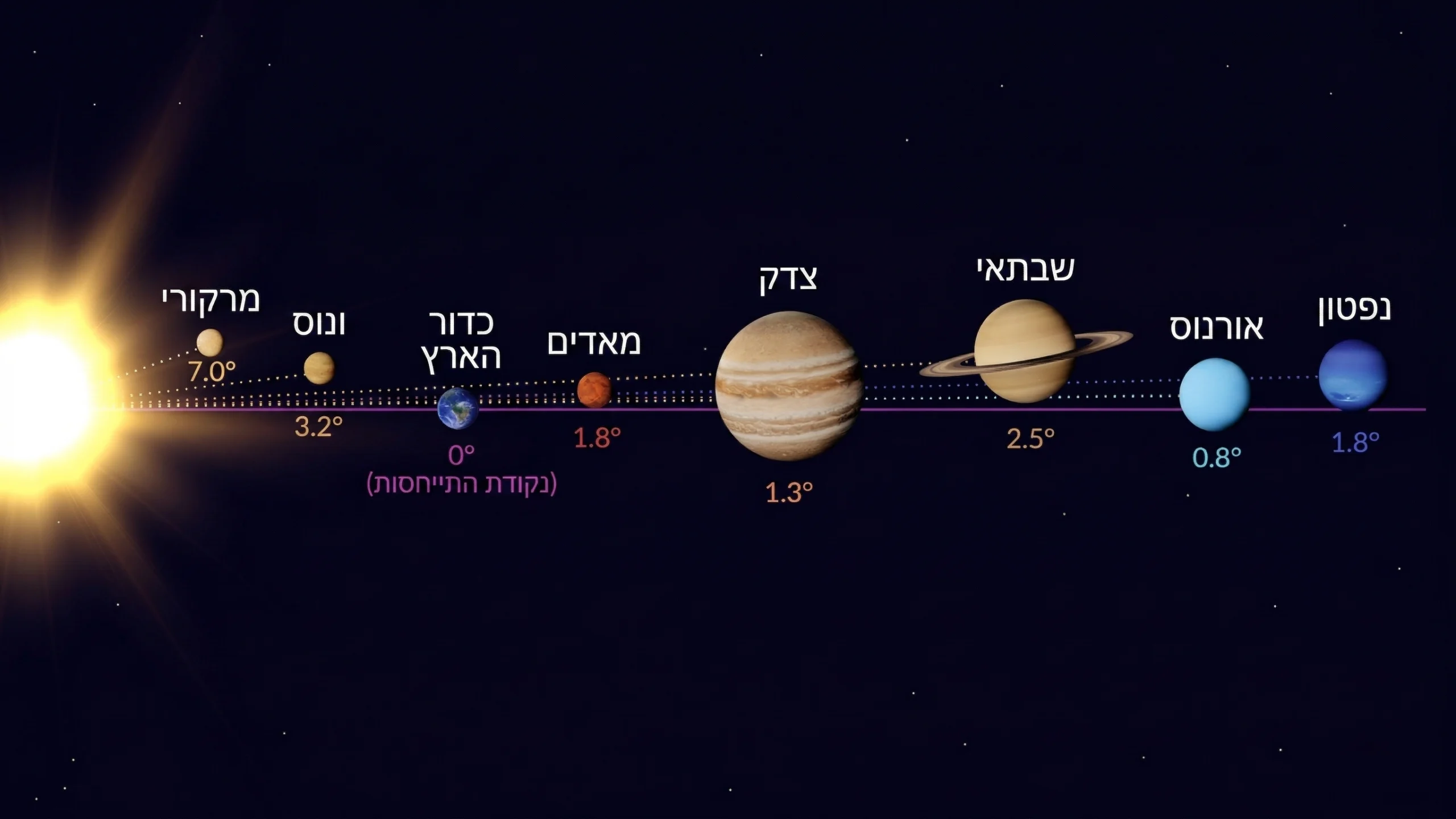 מסלול כדור הארץ נטוי בכמעלה אחת ביחס למישור זה, מסלול צדק בפחות מחצי מעלה, ושאר כוכבי הלכת הגדולים עד כ-6 מעלות.
