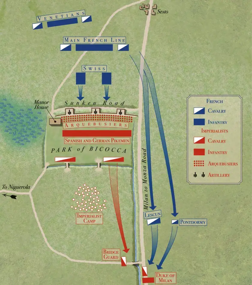 השינויים הללו באו לידי ביטוי ברור בקרב ביקוקה. במאבק הגדול בין קרל החמישי לפרנסואה הראשון על השליטה בלומברדיה ניצבו זה מול זה שני צבאות. צבאו של קרל הונהג בידי הגנרל האיטלקי פרוספרו קולונה, וכלל 19,000 חיילי רגלים ספרדים בהנהגת המרקיז דה פסקארה והלאנדסקנכט הגרמנים בהנהגת גיאורג פון פרוינדסברג, שהיו שכירי החרב הגרמנים. הצבא הצרפתי בפיקודו של המרשל לוטרק היה עדיף בהרבה, ומנה 32,000 איש – מחציתם צרפתים, ונציאנים ואחרים, ומחציתם שווייצרים, שחולקו לשני טורים: האחד בפיקודו של אלברכט פון שטיין מברן, והשני בראשות ארנולד פון וינקלריד מאונטרוולדן. קולונה ולוטרק ניהלו את המלחמה לפי עקרונות ההתשה. לוטרק עורר בכך תרעומת עזה בקרב השווייצרים, שדרשו למוטט את האויב במכה מכרעת, בעוד שהוא ביקש לשתקו במלחמת תמרונים איטית. תוכנית הקרב הייתה ברורה: 16,000 שווייצרים היו אמורים להעסיק את האויב מלפנים, בעוד 16,000 ונציאנים וצרפתים יאגפו אותם. רק לאחר תחילת הקרב באגף, היו השווייצרים אמורים לפתוח בהסתערות.