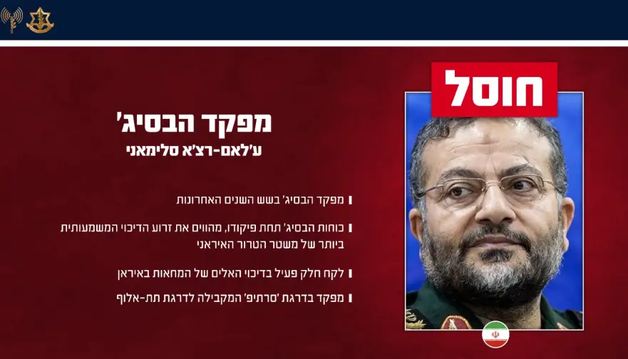 אבל הוא לא היה החיסול היחיד. בצה״ל אישרו כי חוסל גם מפקד יחידת הבסיג', לאם רצ'א סלימאני, שהיה אמון על היחידה שאחראית לדיכוי המפגינים באיראן. הוא חוסל במטה היחידה בטהרן, לצד סגנו ובכירים נוספים בכוחות הבסיג׳.